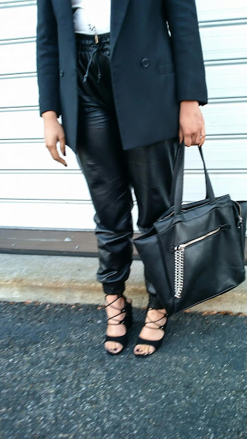 All I can say is Thank God It's Friday but it doesn't mean you have to dress down on this day. Today I decided to incorporate my casual leather joggers into my look however I choose to dress it up. Joggers always get a bad reputation for being casual and unkept but I am here to dismiss those false assumptions. I paired my joggers with a deep plunge bodysuit for a sexy look instead of a simple white T-shirt which is a causal item. I topped the look off with an oversized boyfriend fit blazer and accessorized with a long silver necklace. Finally I dressed up the look with lace up sandals that I refuse to pack away.